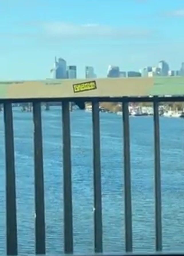 The video presents a static shot through the railing of a bridge. In the background, across a body of water with boats, is a cityscape with several modern buildings. The sky is light blue with a few wispy clouds. On the bridge railing, a yellow and black sticker is visible.