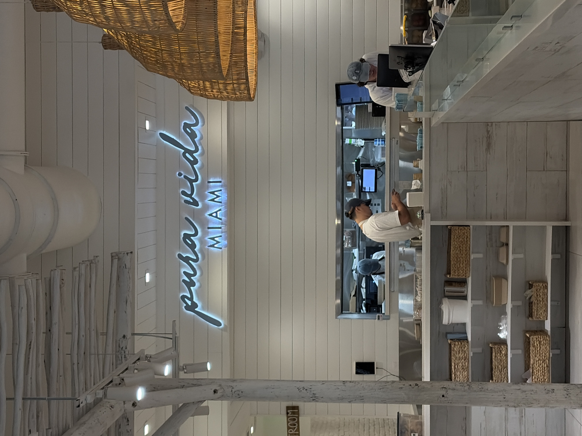 This indoor shot shows the interior of Pura Vida in Coral Gables, United States of America. The neon sign for Pura Vida is on the wall. Below the sign are wooden decorative beams. A worker in a white shirt is standing at the counter, seemingly using a phone. Another person is behind the counter, wearing a white shirt and cap, and working on a computer. Near the workers, there is a storage shelf with wicker baskets and other objects. A wicker decoration is at the top of the shot.