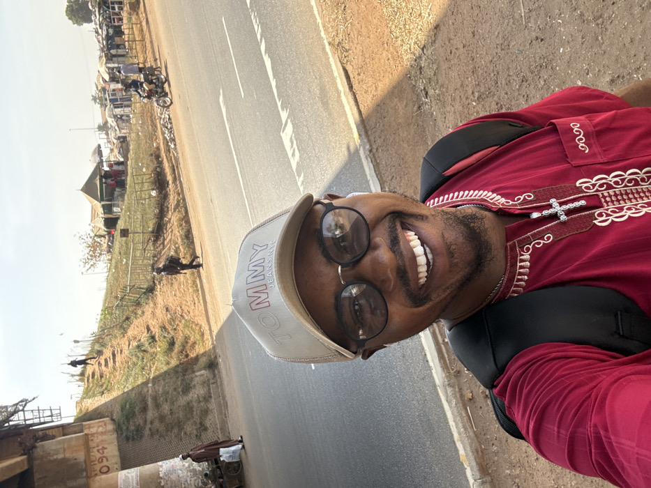 A man wearing a red embroidered dashiki, a black backpack, a beige "TOMMY JEANS NYC" cap, round eyeglasses, and white earbuds, smiles directly at the camera while taking a selfie in Nyanya, Nigeria. He stands on a dirt shoulder next to a paved road with white lane markings. To his left, a concrete bridge support pillar, marked "094," casts a shadow across a dirt embankment. A man in a brown garment stands by a handcart near the pillar. Further up the embankment, another individual walks. Across the road and to the right, a second man walks, and a motorcycle carrying two individuals is present. In the background, several market stalls with canvas roofs are visible, and more structures extend into the distance under a clear sky.
