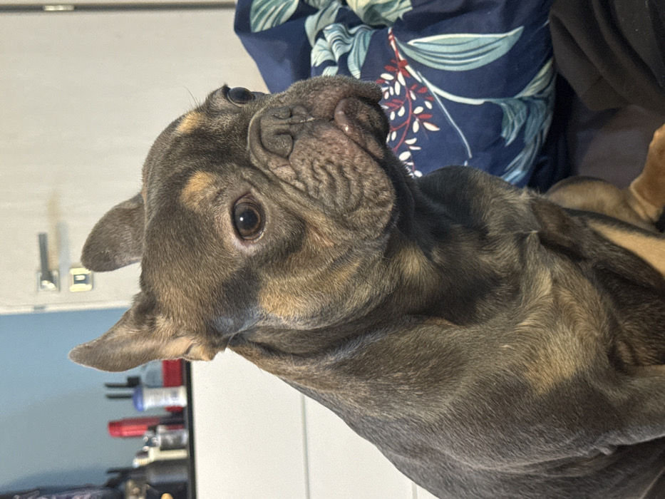 An indoor scene in Burgas, Bulgaria, features a blue-tan French Bulldog prominently seated