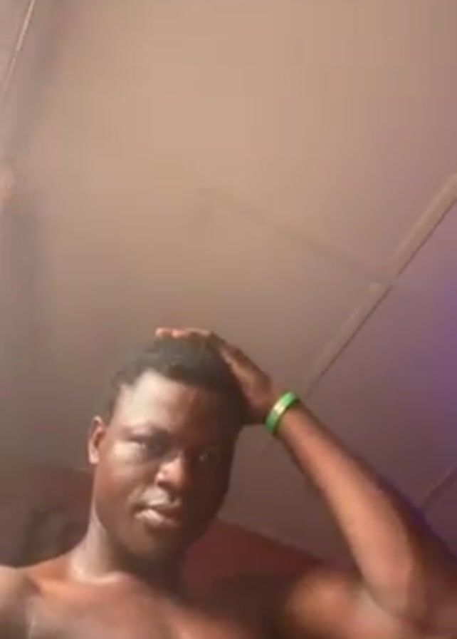 A low-angle shot depicts a shirtless, dark-skinned man with short hair, running a hand through his hair. He is wearing a green bracelet on his right wrist. The background includes a plain ceiling, a glimpse of an overhead light fixture and a portion of a wall with what appears to be a red object or design in the corner. The lighting is somewhat uneven.
