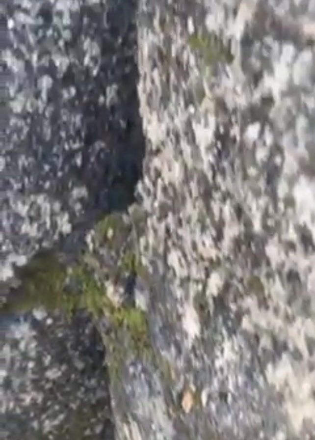 The camera pans up from a close-up of a rock face with some moss, then focuses on an expanse of cracked concrete ground