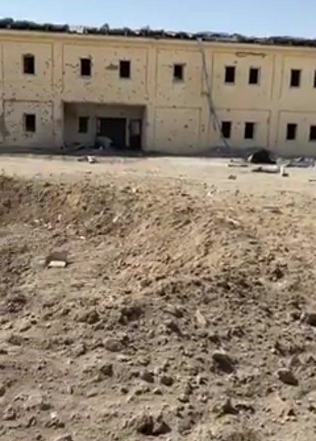 building with damage to the roof and walls. There are numerous holes in the building, and some debris is visible. In front of the building, there is a large crater in the ground, suggesting an explosion. The surrounding area is barren and desert-like. In the distance, there are other buildings that appear to be similar in style. People are walking around the crater. The sky is clear and blue, and the sun is shining brightly.