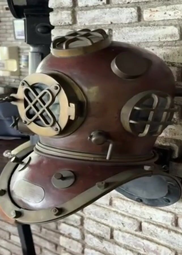 diving helmet mounted on a brick wall