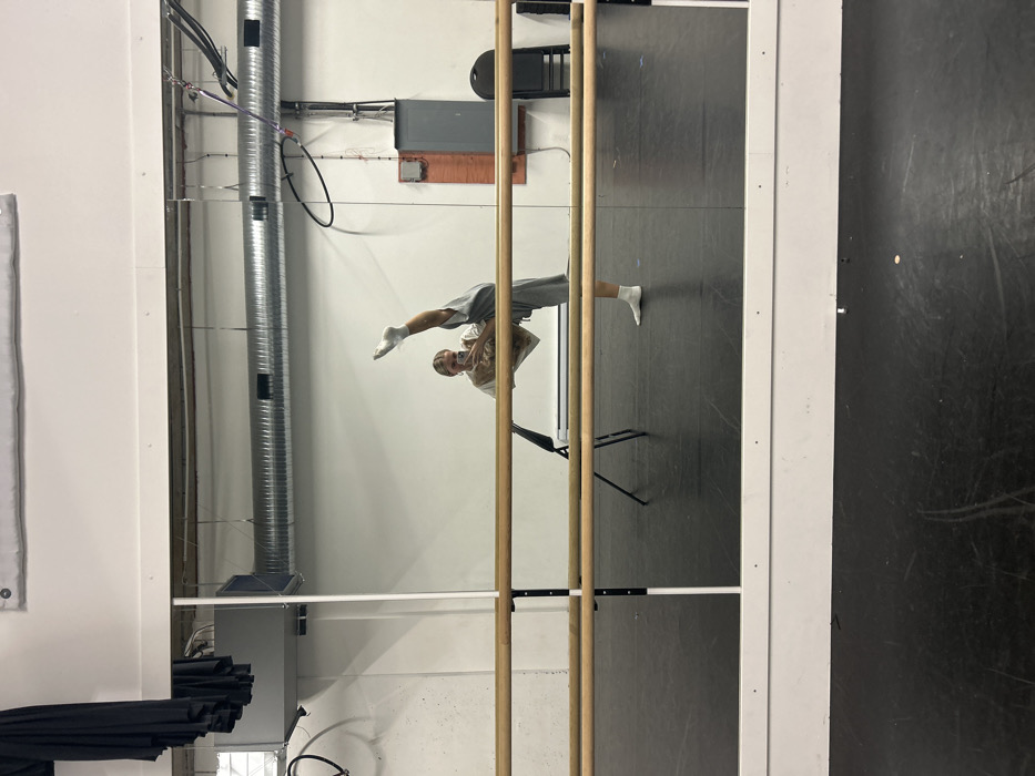 The image depicts an indoor dance or fitness studio, primarily viewed through a large mirror. In the foreground, two parallel wooden dance barres with black metal supports are positioned horizontally across the lower-mid portion of the frame. Reflected in the mirror is a single individual, appearing as a young adult, performing a high leg extension. The individual is dressed in light-colored socks, grey athletic shorts, and a light-colored t-shirt. They are standing on their left foot, with their right leg extended vertically upwards, toes pointed. Their left hand holds a mobile phone, pointed towards the mirror to capture the reflection. Their right arm is bent, resting on the back of a black metal folding chair, which is utilized for support during the stretch. The studio environment behind the individual features white walls and a dark, reflective floor that appears to be a marley-type surface. Overhead, exposed silver-colored HVAC ductwork, black electrical conduits, and a grey electrical junction box are visible on the white ceiling. A dark fabric material hangs in the upper-left reflected corner, and some indeterminate suspended circular rigging is observed in the upper-right. The specific city location within Area D (Elaho/Garibaldi), Canada, cannot be determined from the visual information provided in the image.