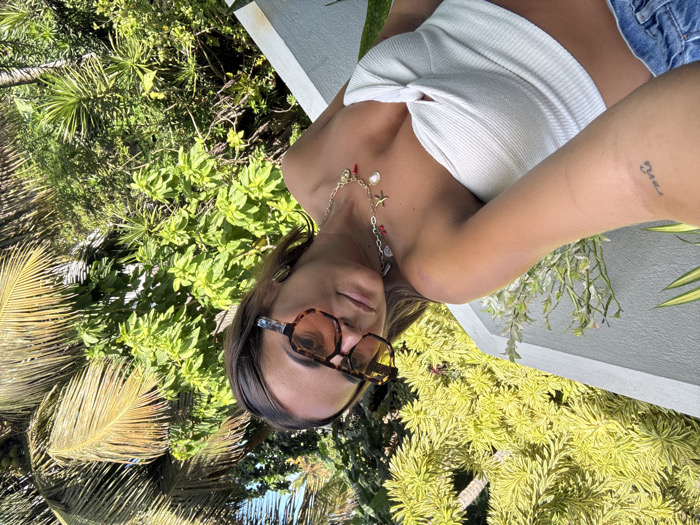 A woman with sunglasses poses outdoors with lush greenery. She wears a white top and a gold necklace with charms. A tattoo is visible on her arm. The environment includes diverse foliage and palm fronds. The image is rotated clockwise.