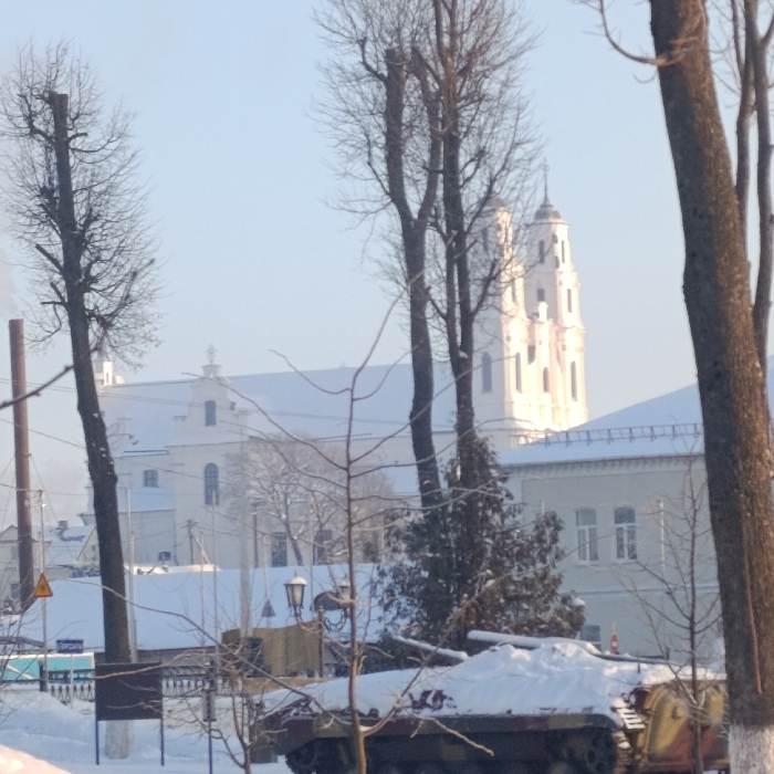 A snowy winter scene captures a partial view of a tan and green military tank, partly covered in snow. Bare trees frame a white church or cathedral with distinctive towers in the background. A building with windows and a white roofline sits between the church and the tank, blending into the snow-covered landscape. The scene is bright, with the winter sun casting shadows on the snow.