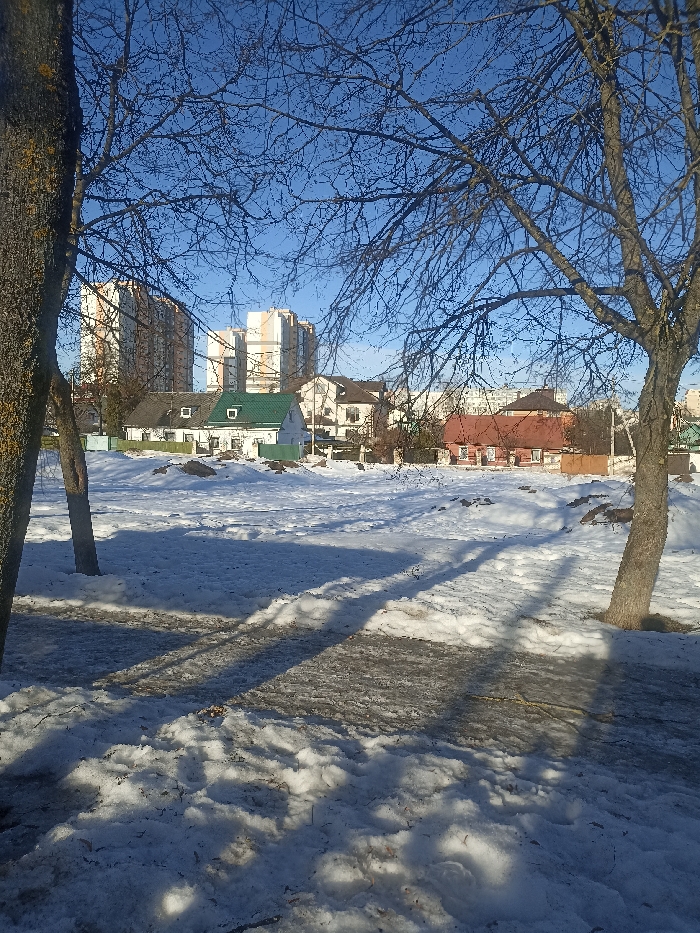 The image displays a winter outdoor scene in Minsk, Belarus, under a clear blue sky. The foreground shows snow-covered ground with visible patches of dark earth or pavement, marked by long, distinct shadows from two large, deciduous trees with bare branches that frame the left and right sides of the composition. In the midground, an open, snow-covered area stretches horizontally. Behind this area, a row of single-story residential houses is visible, including a white structure with a green roof positioned centrally and an orange-red house with a brown roof to the right. Fences delineate the property lines of these houses. In the background, several tall, modern high-rise residential buildings stand prominently against the sky. No individuals are present in the scene. The overall environment suggests cold, clear weather conditions.