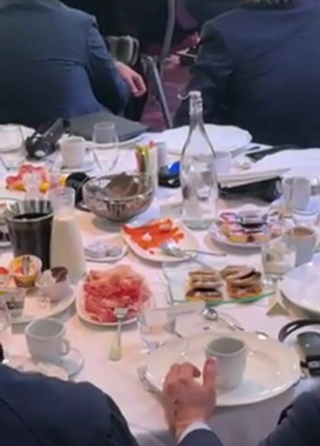 table covered with a white tablecloth in a conference room. Several people are seated around the table, visible from the back. The table is set for a meal, with plates, cutlery, glassware, and several dishes of food. These include what appears to be sliced ham, salmon, small sandwiches, and desserts. A glass bottle of water and a pitcher of milk are also visible. A man's hands are visible in the foreground as he adjusts his coffee cup.