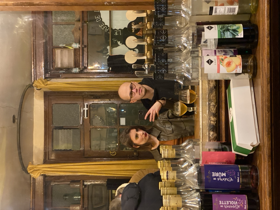 The image depicts a couple reflected in a mirror in what appears to be a bar or café setting. On the counter, there are bottles of various liqueurs and syrups, including "Liqueur de Violette", "Crème de Mûre", and syrups with different flavors such as peach and mint. Beer taps are visible behind the couple, and the reflection shows the café's interior with a sign that reads "LE CAFE DE I". The couple seems to be posing for the photo, with drinks visible near the taps.
