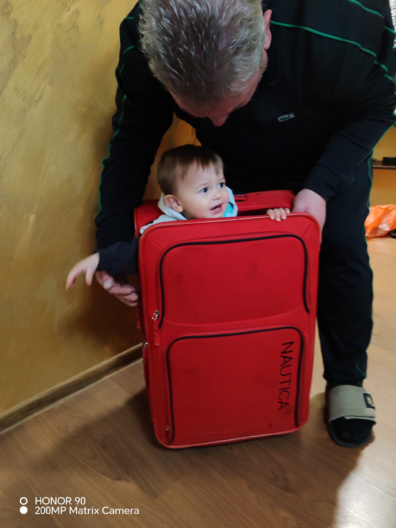 A man is putting a baby into a red suitcase labeled "NAUTICA". The man is wearing a black track suit with green stripes and black sandals with a grey band. The baby is fair-skinned and wearing a light blue and grey sweatshirt. They are standing on a brown wooden floor in front of a tan wall. The location is unknown.