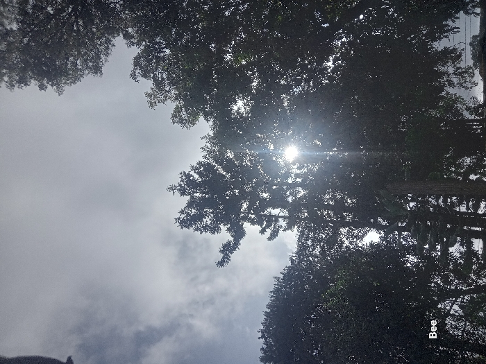 Looking upwards, the image showcases a dense canopy of trees silhouetted against a cloudy sky