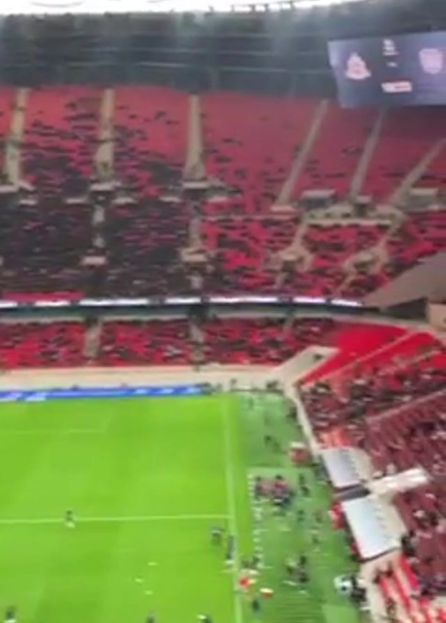 soccer stadium filled with spectators, primarily dressed in red. A soccer game is taking place on a green field, with players in white and dark jerseys. The camera is positioned high in the stands, providing a wide view of the field and the crowd. The spectators are dense in the stands, appearing engaged in the game. There are some visible team logos and text in Arabic above the stands, indicating it may be a Middle Eastern or North African sporting event. The players are spread across the field, and there are a few people walking near the sidelines. The video appears to be taken with a hand-held device, as there's some shakiness in the movements.