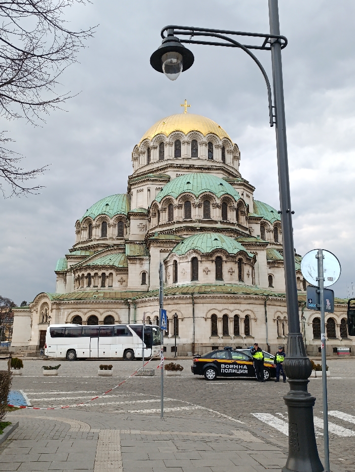 The image depicts the St. Alexander Nevsky Cathedral in Sofia, Bulgaria, under an overcast sky. The cathedral features a large central golden dome topped with a cross, surrounded by multiple smaller green domes and a light-colored, multi-tiered facade. In the foreground, a paved urban square is visible with a dark grey street light pole positioned prominently on the right, extending towards the upper right corner. Bare tree branches are visible in the upper left. Across the mid-ground, red and white striped barrier tape delineates an area. Behind this tape, a white tour bus is parked on the left, facing right. To its right, a black sedan marked with yellow "ВОЕННА ПОЛИЦИЯ" (Military Police) lettering and a roof-mounted light bar is parked. Two individuals, both wearing high-visibility yellow vests over dark clothing, stand near the driver's side of the military police vehicle. One individual is positioned closer to the vehicle's front, while the second stands slightly to their right and behind. Several dark planters containing small shrubs are placed intermittently on the paved area. A grey pole with a circular white sign is also present near the barrier tape.