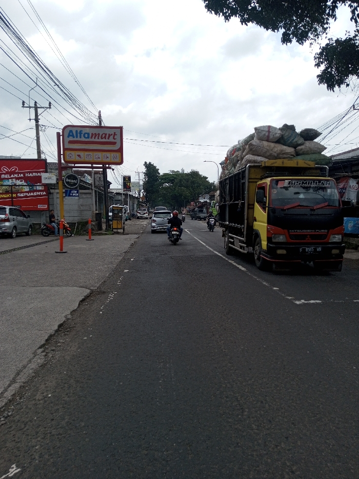The image displays an active street scene under an overcast sky in the city of Khajuripada, India. A wide asphalt road, showing signs of wear, occupies the center and foreground. On the right side of the road, a yellow and black Mitsubishi Fuso truck, prominently displaying "BISMILLAH" on its cab and license plate F 8969 WN, moves away from the viewer. Its open cargo bed is heavily loaded with numerous large, irregularly shaped sacks, which appear to contain bulk materials. In the middle of the road, a motorcyclist wearing a dark helmet and jacket rides a motorcycle away from the camera. Further down the street, another motorcyclist and several passenger cars are visible in motion. To the left of the road, a paved area serves as a sidewalk and parking space. A prominent red and white Alfamart convenience store sign is mounted on a pole, with a smaller sign below it indicating "ATM / BCA". A red banner, partially visible, displays Indonesian text including "BELANJA HARIAN". Two individuals are seated on a parked motorcycle on the paved area near the Alfamart. Utility poles with numerous overhead power and communication lines traverse the upper left portion of the frame. Trees and additional commercial structures line the road in the background.