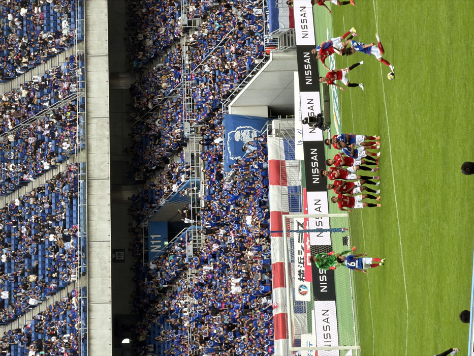 This image depicts a live soccer match at Nissan Stadium (International Stadium Yokohama) in Yokohama, Kanagawa Prefecture, Japan, viewed from an elevated position within the stands
