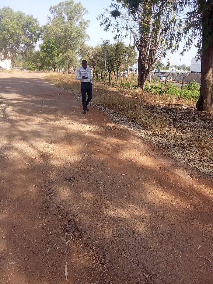 The image portrays an outdoor scene on an unpaved, reddish-brown dirt road in Bar Jirgi Summa, Nigeria. An adult male, dressed in a light-colored striped long-sleeved shirt, dark trousers, and dark shoes, walks from left to right, positioned centrally on the path. He holds a dark-colored smartphone with both hands, looking down at the device. The road surface exhibits small stones and minor depressions. Dry, light-brown grass and fallen leaves line the edges of the road. Trees with green and sparse foliage are visible on both sides of the path, casting shadows across the ground. In the background, to the right, a low barrier or fence precedes a light-colored building with a blue roof and a red and white flag. A white vehicle is partially visible behind the barrier. The scene is brightly lit by natural sunlight.