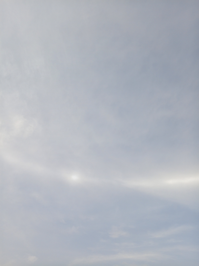 The image displays a sky scene above New Stadium, Nigeria. The sky is largely overcast with light grey clouds. A distinct atmospheric optical phenomenon is visible, characterized by a bright, horizontally elongated band of light stretching across the mid-section of the frame. Within this band, a prominent, circular bright spot is located slightly to the left of the image center, consistent with a sun dog or parhelion. A second, fainter bright spot is discernible further to the right along the same horizontal arc. No ground, structures, people, or other objects are visible in the frame.