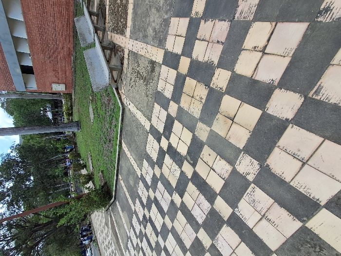 A tilted view showcases a building with a brick facade and gray trim, adjacent to a paved area with a black and tan checkered pattern