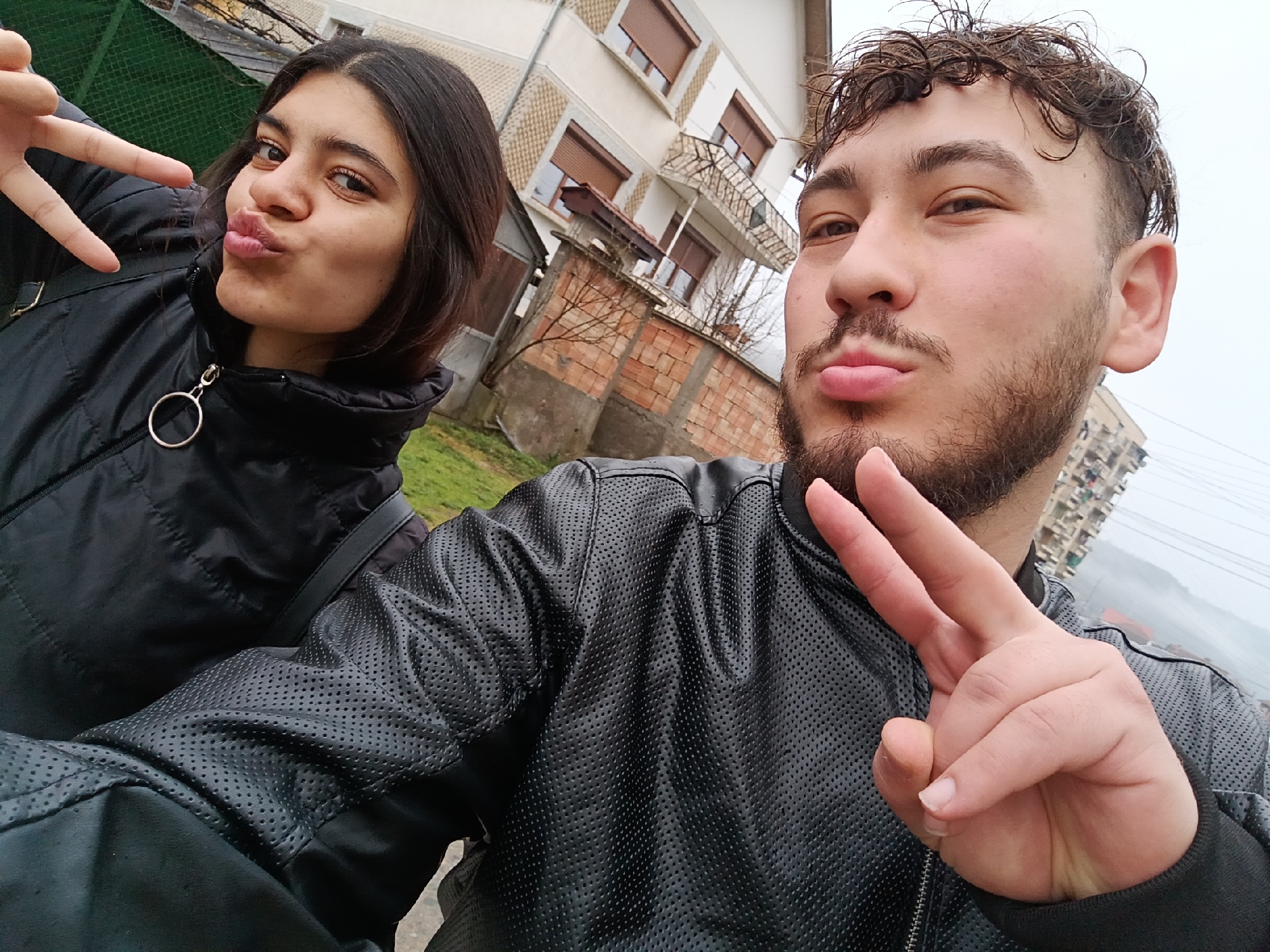 The image presents a selfie-style portrait of two individuals, a female and a male, situated outdoors in the city of Roman, Bulgaria, under an overcast grey sky