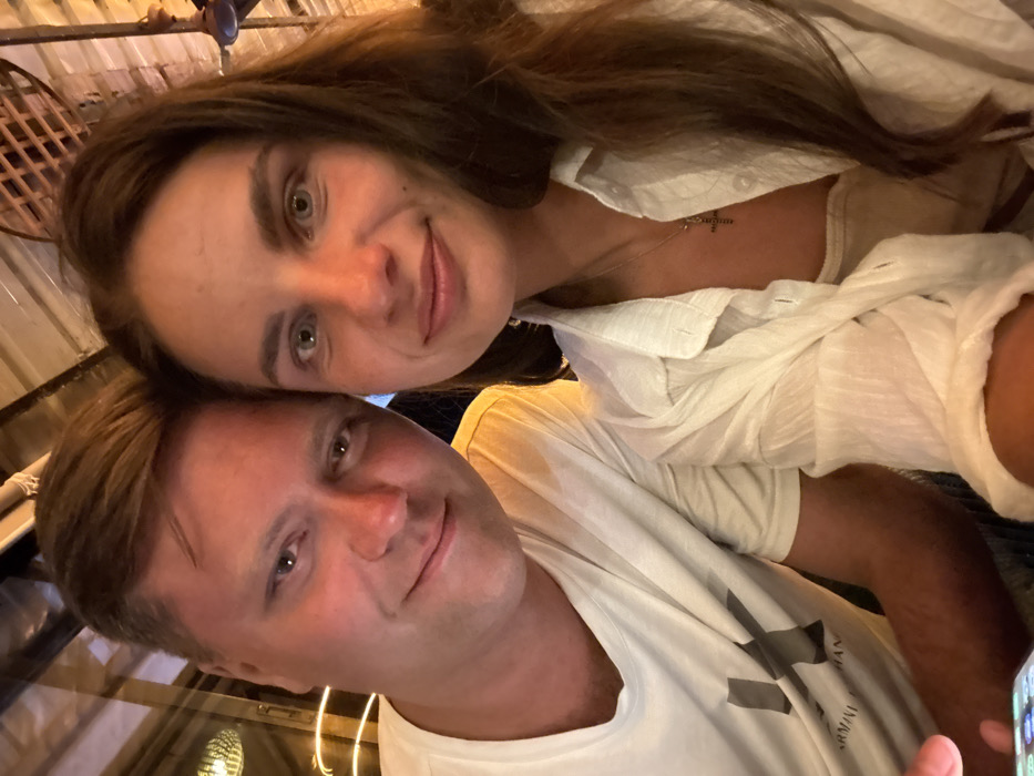 A selfie shows a man and woman close together. The woman has long brown hair, light eyes, and wears a white blouse with a cross necklace. The man, with short blond hair and light eyes, wears a white T-shirt with Armani Jeans branding. They both smile slightly. The photo seems to be taken in a dimly lit restaurant.