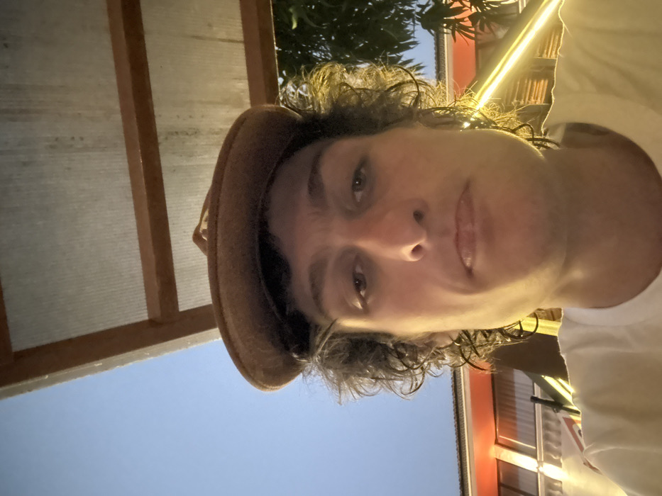 The image displays a close-up, head-and-shoulders portrait of an adult male, taken in the city of Calangute, India. The subject, positioned centrally and looking directly at the camera, has pale skin, dark curly hair, and dark eyes. He is wearing a brown cap and a white short-sleeved t-shirt. His tongue is slightly protruding from his mouth, conveying a neutral to mildly pouting expression. Above the subject, a translucent corrugated roof structure, supported by horizontal wooden beams, occupies the upper portion of the frame. The background reveals an outdoor or semi-outdoor setting during what appears to be twilight or early evening. A light blue-grey sky is visible on the upper left. To the subject's left, a building with a reddish-orange facade featuring horizontal elements is partially visible. To the right, green foliage is present, illuminated by bright yellow-orange artificial strip lighting that extends horizontally across the mid-ground. The lighting suggests an active commercial or social area.