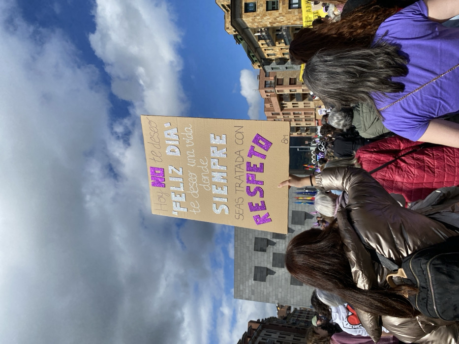 An outdoor gathering is depicted in an urban area of Villaviciosa, Spain, under a partly cloudy sky. The scene shows a dense crowd of people, predominantly women, viewed from behind as they face forward, indicating participation in a public event. In the immediate foreground, a woman with long dark hair, wearing a metallic gold puffer jacket and a black backpack, holds aloft a handmade cardboard sign. The sign, measuring approximately 60x80 cm, displays Spanish text in a mix of handwritten black ink and glitter letters. The text reads: "Hoy NO te deseo 'FELIZ DÍA' te deseo una vida donde SIEMPRE SEAS TRATADA CON RESPETO." This translates to: "Today I do NOT wish you 'HAPPY DAY' I wish you a life where you are ALWAYS TREATED WITH RESPECT." The words 'NO' and 'RESPETO' are rendered in purple glitter, while 'FELIZ DÍA' and 'SIEMPRE' are in silver glitter. The letters "8M" are visible in the bottom right corner of the sign. Other individuals in the foreground include a woman to the right of the sign-holder, wearing a red quilted jacket, and further right, another woman in a purple t-shirt with greyish-brown hair. The background features a mix of architectural styles. To the left, a large, modern building with a grey, geometric, and textured facade stands prominently. To the right, a row of traditional multi-story urban buildings with balconies and light-colored exteriors is visible. A line of flags on poles, including the Spanish flag, is visible between these architectural structures. The sky above is marked by scattered white and grey clouds against patches of blue.
