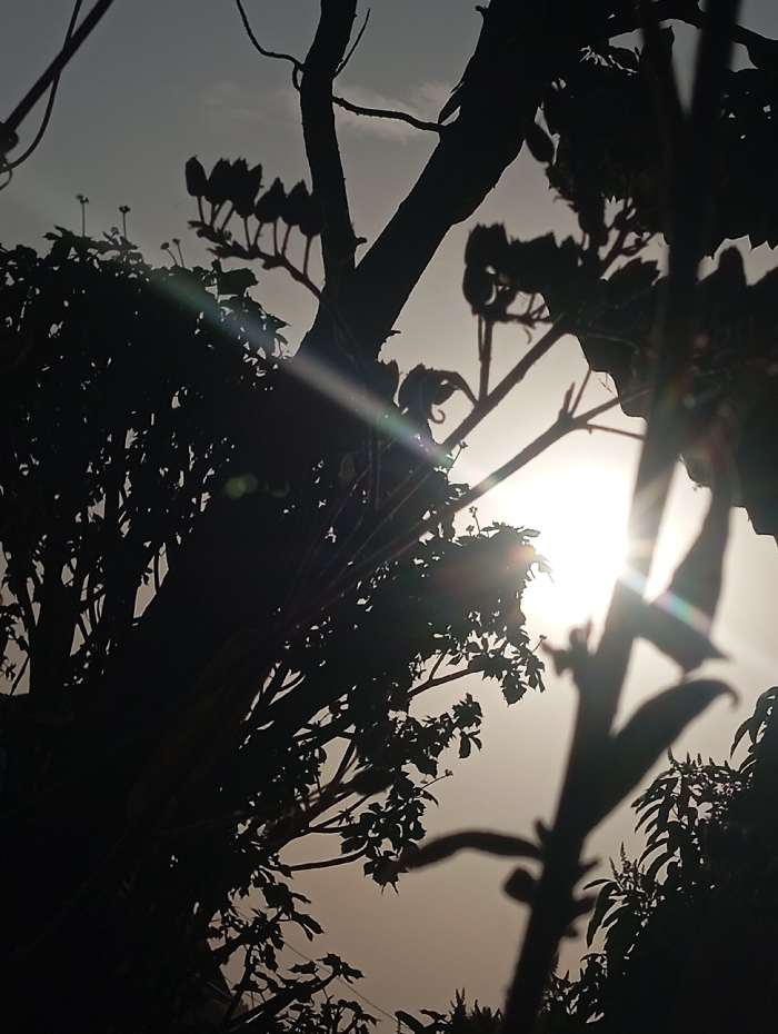 Silhouetted tree branches and foliage frame a bright, obscured sun. The dark shapes of leaves and stems create a dense foreground, with some buds or flowers evident. Sunlight flares through the gaps, creating distinct lens flares. The overall tone is muted and atmospheric, suggesting a sunset or dawn scene. The strong contrast emphasizes the natural elements.