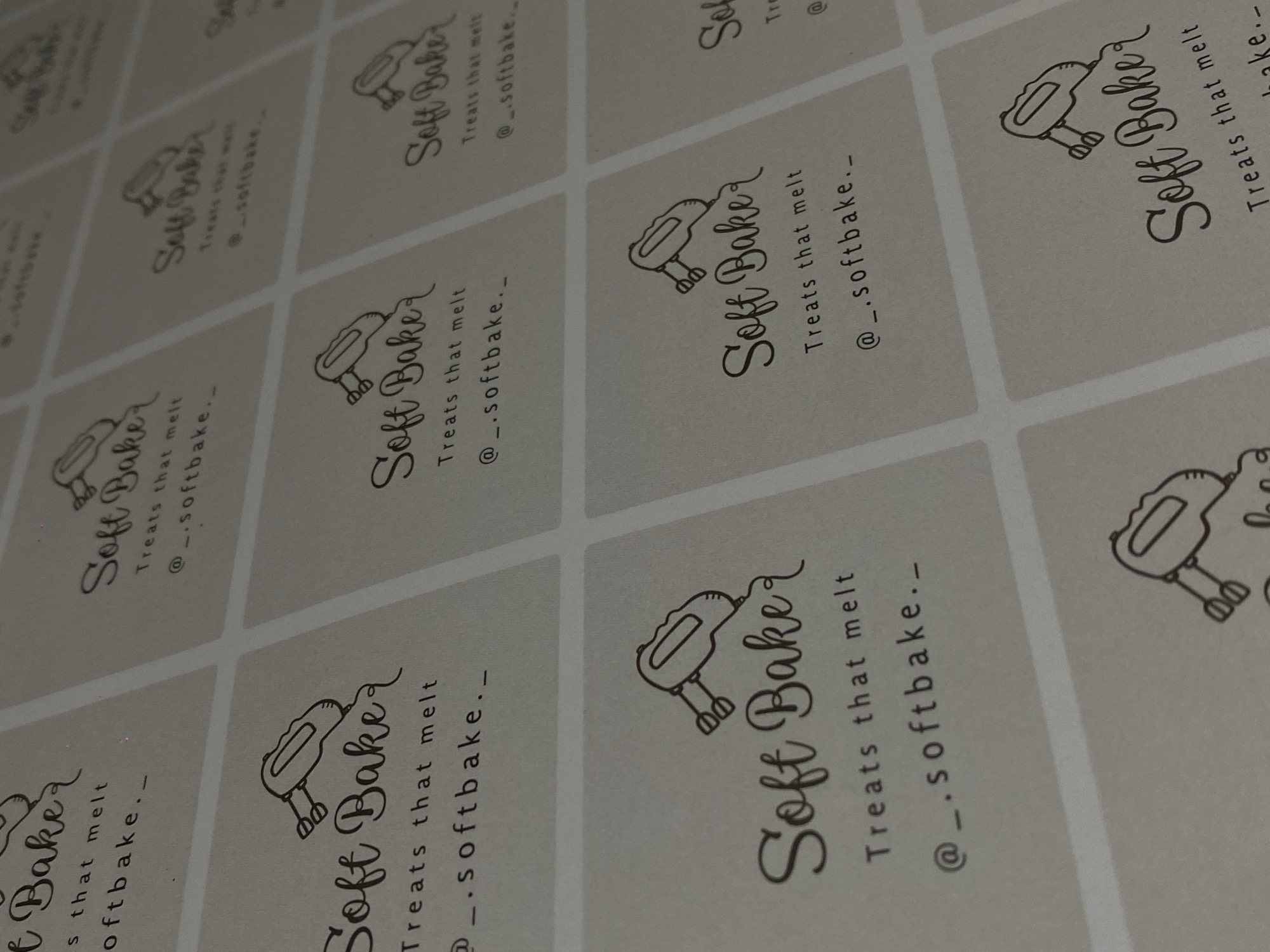 close-up of a sheet of stickers or labels, each featuring a logo for "Soft Bake