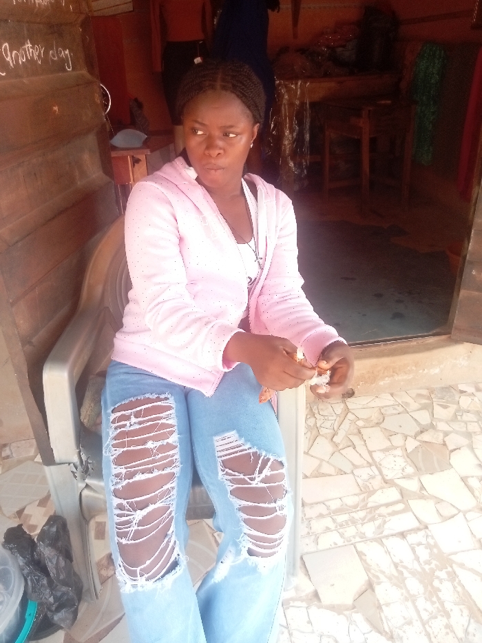 In Ogidi, Nigeria, a young Black woman is seated on a light grey plastic chair within what appears to be a small shop or room