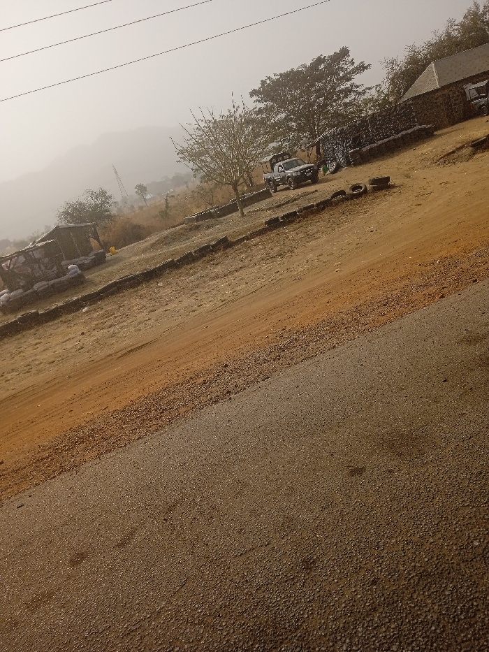 The image depicts an outdoor scene in Tilde, Nigeria, characterized by dry, dusty conditions. In the foreground, a paved, granular asphalt road, grey-brown in color, angles diagonally from the lower left to the upper right. Immediately adjacent to this road, occupying the midground, is a wide expanse of reddish-brown dirt and dry earth. This dirt area is bordered by a low, linear arrangement of stacked dark objects, consistent with vehicle tires. To the left in the midground, a small, rustic structure, possibly a shed or stall, is visible, constructed from light-colored materials. Piles of dark, bagged or bundled items are stacked in front of this structure. Centrally positioned, a leafless tree with slender branches stands. To the right of the tree, a dark-colored pickup truck, possibly a double-cab model, is parked, facing right. It has an open bed or a canopy structure. Further to the right, a building with a dark, sloped roof and walls constructed from dark, stacked materials (appearing to be tires or dark stones) is partially visible. Several loose vehicle tires are scattered on the dirt ground near the parked truck and building. The background features hazy, light-colored mountains or hills. Multiple thin power lines are visible spanning the upper portion of the sky. A tall, slender mast or tower is faintly discernible in the distant background, left of center. No people are present in the image. The scene is illuminated by natural, diffused light, suggesting daytime and a dry or dusty atmospheric condition.