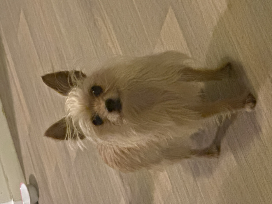 - "A small, long-haired domestic dog stands centered on a light-colored, wood-grain patterned floor" by FM-aVDG03, licensed under CC BY 4.0