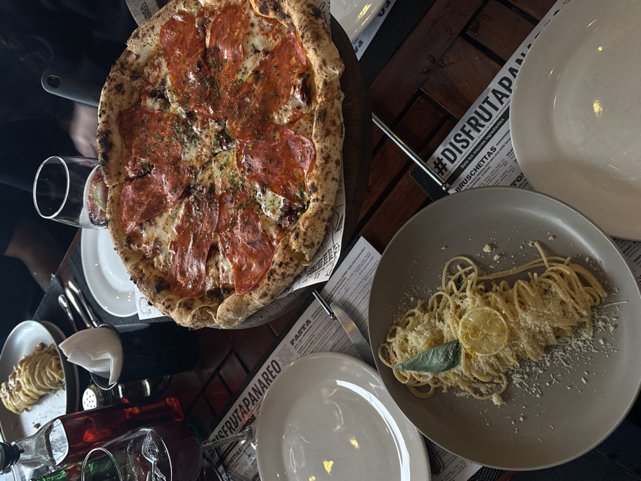 This image captures a close-up, high-angle view of a dining table laden with food and drinks within a restaurant in San Bernardino Tlaxcalancingo, Mexico. The central focus is a large, round, Neapolitan-style pizza, cut into eight slices, situated on a circular wooden board elevated by a metallic stand in the mid-right. The pizza features a thick, charred crust, melted cheese, and generous coverings of dark red, thinly sliced pepperoni or salami, with green herbs sprinkled across the surface. In the lower-left foreground, a grey round plate holds a serving of spaghetti, coated in a light sauce, generously topped with grated cheese, and garnished with a lemon slice and a fresh basil leaf. A white, round, empty plate is positioned to the right of the spaghetti dish. In the upper-left background, another white round plate contains a portion of pasta, appearing as a tangled mound. Beverages include a stemmed glass in the mid-left containing a dark red drink with ice cubes and a garnish, and a clear glass bottle with a stopper, filled with a similar red liquid, situated next to it. Another stemmed glass, partially filled with red liquid, is visible behind the pizza stand in the upper-right. Additional objects on the dark wooden plank table include a dark cylindrical holder containing a white folded napkin, a silver-topped condiment shaker, a silver knife positioned near the foreground white plate, and another set of cutlery (knife and fork) near the background pasta dish. Paper menus or placemats with text fragments like "DISFRUTAPANAREO", "PASTA", and "BRUSCHETTAS" are visible under the dishes. A person's arm and torso, clad in dark clothing, are partially visible in the upper-right background, implying a diner is seated at the table.