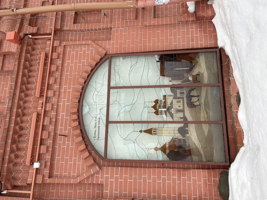 An exterior shot frames a red brick wall with decorative courses and an arched window, partially obscured by snowdrifts at its base. The brickwork includes a sawtooth pattern and a corbel course above the arch. Several reddish-brown pipes and conduits, along with a square electrical box and small white fixtures, are mounted on the wall's upper right section. The large, arched window features a reddish-brown frame and is divided by vertical mullions. It contains a decorative glass panel depicting a stylized landscape of Klin, Moscow Governorate. In the upper left quadrant of the glass, Cyrillic text identifies "г. Клинъ, Моск. Губ. Троицкий собор." The scene within the glass panel shows multiple buildings, including a prominent light-colored bell tower with a spire and a church with five reddish-brown onion domes (the Trinity Cathedral). Additional buildings with golden onion domes and traditional roofs are visible. In the foreground of the depicted scene, a dark-colored horse grazes on stylized terrain, and a small cart laden with a white object is present to its right. Snow covers the ground in front of the wall, forming uneven mounds reaching up to the window's lower frame.