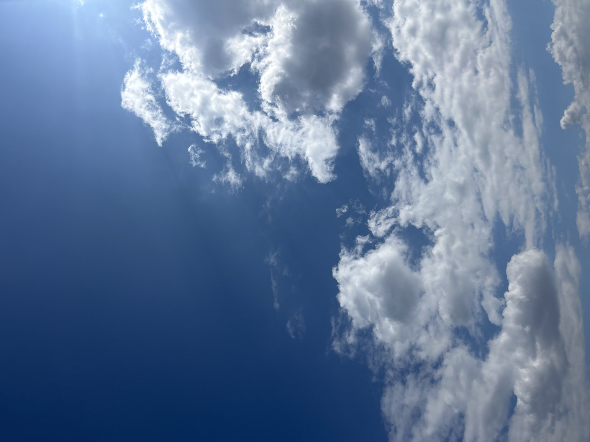 The image displays an expansive view of the sky over Mala Fucha, Bulgaria. The upper-left portion of the frame shows a clear, deep blue sky. The remainder of the frame is occupied by numerous white and gray cumulus and stratocumulus clouds, varying in size and density, scattered across the mid and lower sections. A prominent sun flare or bright light source is visible in the upper-right corner, partially obscured by clouds, illuminating the scene. No terrestrial features, structures, people, animals, or objects are present. No actions or interactions are depicted.