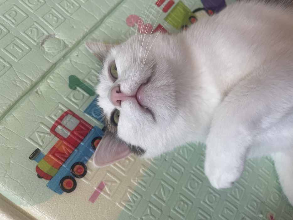 - "A white cat with green eyes lies on a baby playmat featuring alphabet letters and a colorful train" by FM-6N9303, licensed under CC BY 4.0