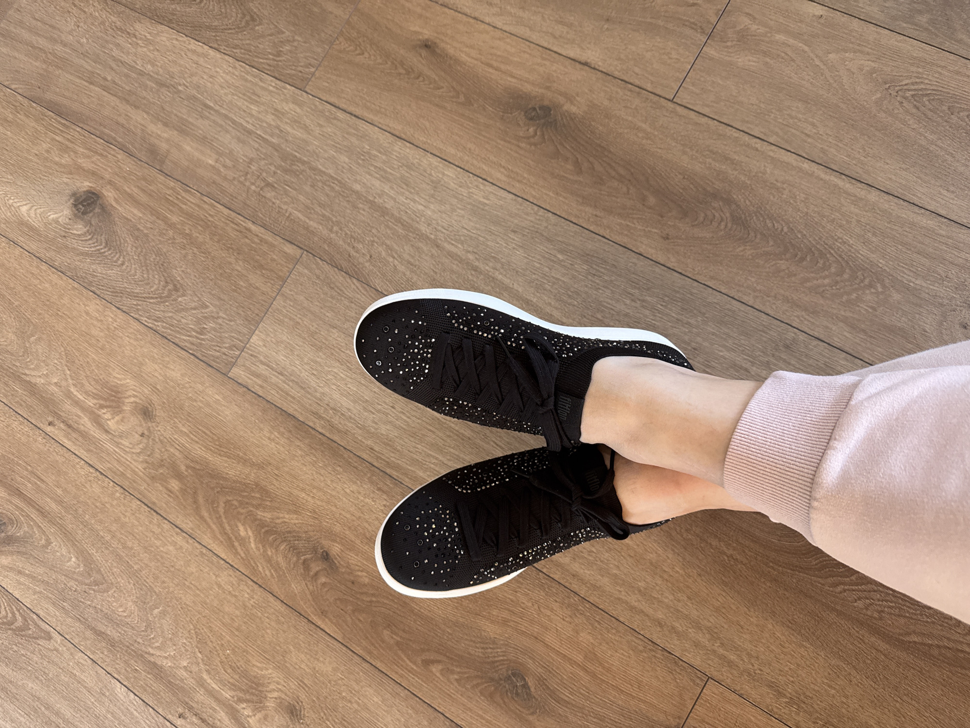 The image displays a person's lower legs and feet, with ankles crossed, resting on a clean, light brown laminate floor. The individual is wearing black sneakers with white soles and black laces. The upper surface of the sneakers is embellished with numerous small, silver-colored studs or rhinestones. A white "Fitflop" brand label is visible on the outer side of the right shoe. The person is also wearing light pink or peach-colored soft fabric pants with ribbed cuffs visible around the ankles. The floor planks are laid diagonally, exhibiting a wood grain pattern. No specific landmarks or distinguishing features are present to determine a precise location within Sofia, Bulgaria.