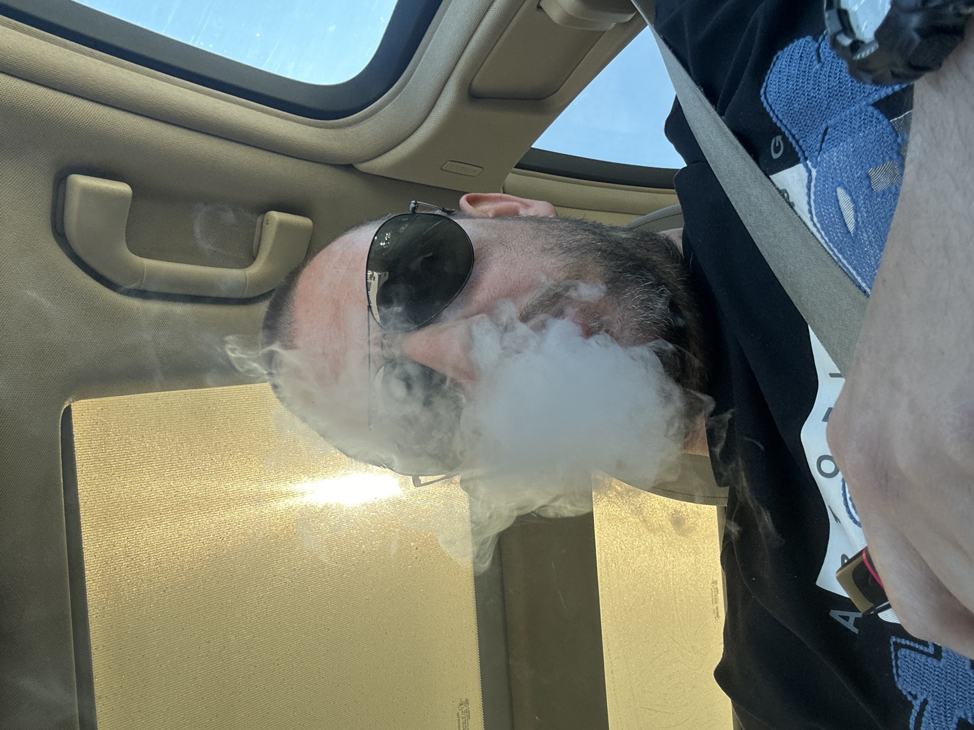 The image depicts a man wearing sunglasses exhaling a large cloud of vapor inside a car