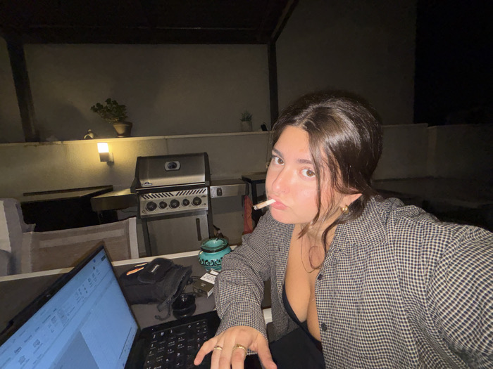 A person poses outdoors at night with a cigarette in their mouth. They wear a dark, low-cut top and an open gray and white checkered shirt. A laptop sits in front of them. Behind the person, a stainless steel grill stands on a patio. There's a small light on a wall, and plants are visible on the ledge behind the grill. The scene is dimly lit.