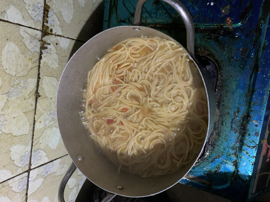 - "An aluminum pot containing light yellow spaghetti, diced red tomatoes, and other ingredients in a clear broth is depicted actively simmering on a single-burner gas stove" by FM-Bnl7b2, licensed under CC BY 4.0
