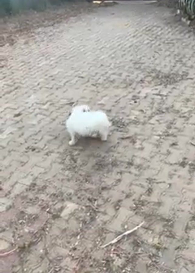 small, white and grey Shih Tzu puppy standing on a brick-paved driveway. The puppy is walking forward and then turns its head towards the camera. The ground is covered with leaves and small branches. In the background, there is a closed gate and some vegetation. The day is overcast.