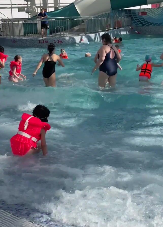 The scene is an indoor water park where multiple people, including adults and children, are enjoying themselves in a wave pool