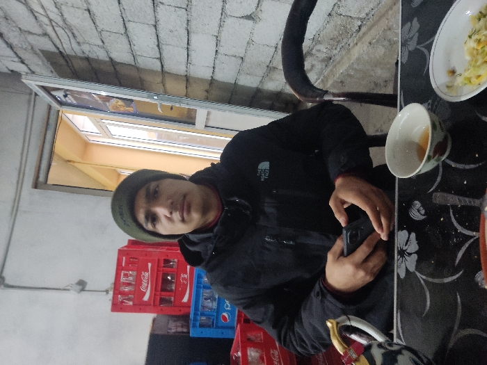A man in a black jacket and green beanie sits at a table, holding a smartphone. On the table, there's a bowl with some liquid, a plate with food, and a black table surface with a floral pattern. Background shows a brick wall, a window, and several stacks of red and blue Coca-Cola and Pepsi crates. The man appears to be indoors, possibly at a casual dining spot.