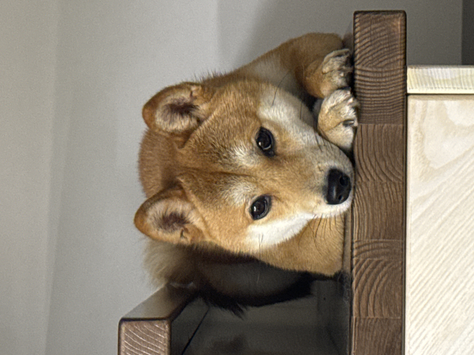 A Shiba Inu dog with reddish-tan fur, white underparts, and dark eyes is positioned centrally in a medium-shot photograph. The dog is lying down, facing forward, with its head resting on its front paws. Its triangular ears are erect. The dog is situated on a dark brown wooden surface, likely a stair tread or shelf, exhibiting visible end-grain patterns. Below this, a lighter-toned wooden structure is partially visible. The background consists of a plain light grey wall, with a shadowed area to the left of the dog. The lighting is soft and ambient. The scene depicts an indoor environment in Carnikava, Latvia.