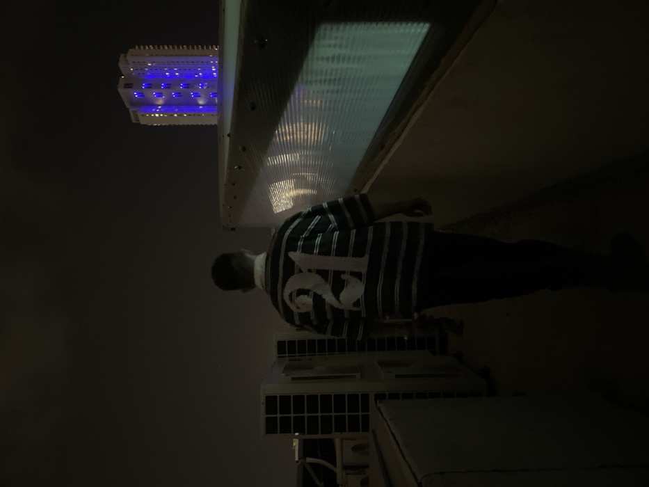 A person wearing a striped shirt with the number "12" on the back stands outside at night. Overhead, a building with blue lights is visible. The person is next to several large, boxy structures, possibly air conditioning units or equipment housings. The lighting is dim, and the environment appears urban or industrial. The image is oriented sideways.