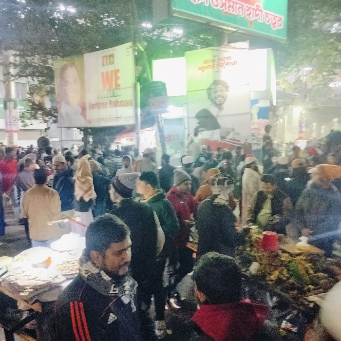 - "This image captures a crowded, illuminated nighttime street scene in Dhaka, Bangladesh, near the Smriti Osman Ali Stadium, as identified by a green sign visible at the top" by FM-rkNqI2, licensed under CC BY 4.0