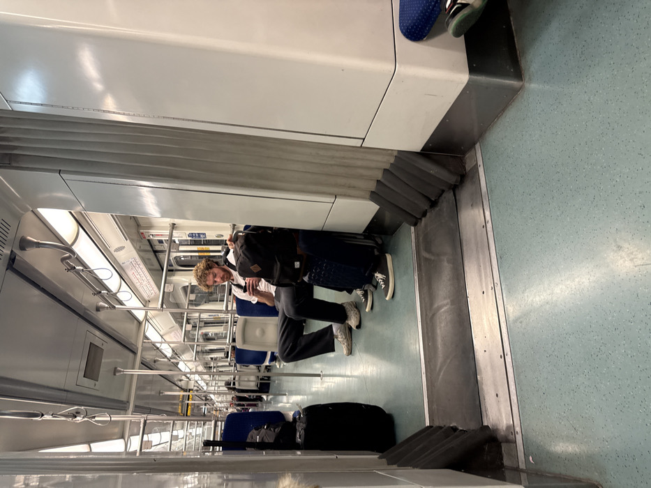Inside a subway car, a fair-skinned man with curly blonde hair sits on a blue seat, focused on his phone. He wears a white shirt, dark pants, and gray sneakers. A black backpack and a navy blue suitcase rest next to him. Other passengers are seated further down the car. The floor is speckled blue-green. Handrails run overhead. Luggage occupies the floor space between seats.