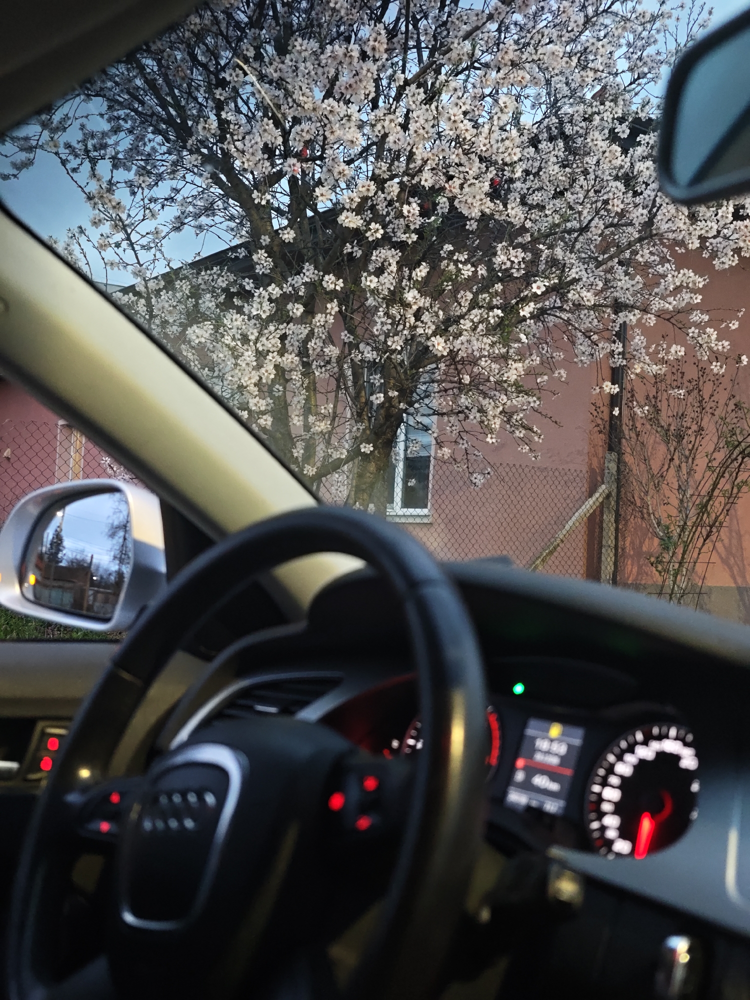 The image depicts a view from inside a car, likely an Audi, with the dashboard and steering wheel partially visible. The car appears to be stationary. The speedometer indicates a low speed. Outside the car, a flowering tree with white blossoms dominates the view through the windshield. Behind the tree, a peach-colored building is partially visible, along with a chain-link fence. The reflection in the side mirror shows trees and possibly another building. Given the mention of Kozloduy, Bulgaria, it is inferred that the scene is located in this city.