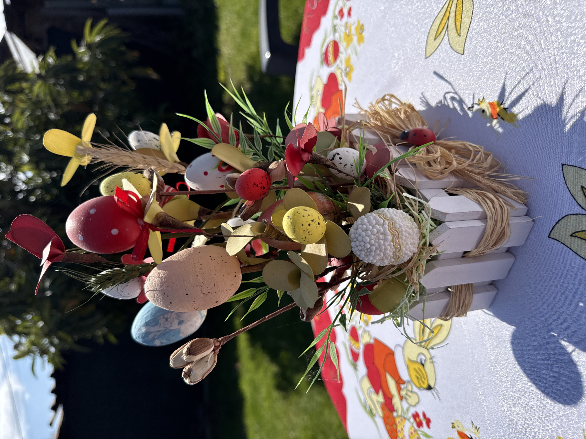 On a white tablecloth with a rabbit and flower pattern, a wooden fence-like holder holds an Easter decoration. The decoration includes various painted eggs, red berries, green leaves, and yellow faux flowers. A ladybug is attached to the straw around the fence. The scene is outdoors, with green grass and trees visible in the background. The location is likely Perushtitsa, Bulgaria, based on the prompt.