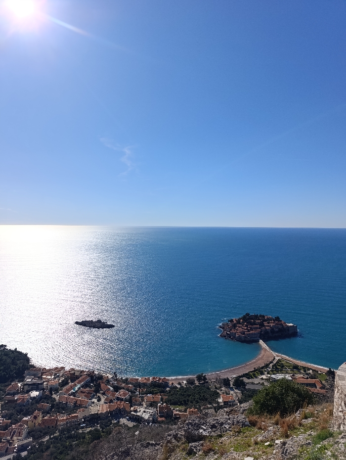 A high-angle shot captures a coastal vista under a bright, sunny sky. The sparkling sea fills much of the frame, reflecting the sun. A small island covered with buildings is connected to the mainland by a narrow isthmus of sand. The shoreline features a quaint town of red-roofed buildings nestled amongst trees, cascading down to the beach. A smaller, rocky islet sits closer to the town, punctuating the scene.